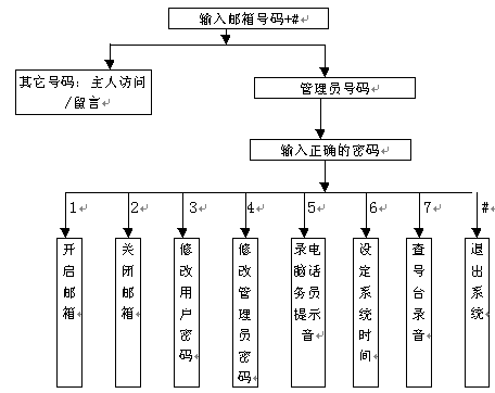 4). 主人密碼:信箱主人訪問自己信箱的口令。主人可以通過訪問自已的信箱修改密碼,若主人忘記密碼可通過管理員將其設(shè)置為缺省值0000。