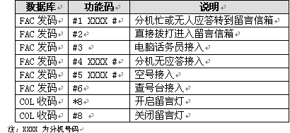 若您要的分機(jī)正在忙或分機(jī)主人不在電話機(jī)旁,可直接轉(zhuǎn)到留言信箱,止項(xiàng)功能要求在交換機(jī)數(shù)據(jù)庫中設(shè)置分機(jī)遇忙/無應(yīng)答轉(zhuǎn)移到留言信箱。