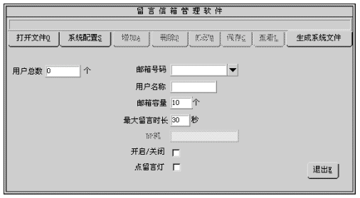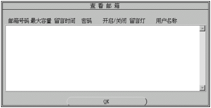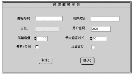 1). 您可修改的參數(shù)有:用戶名稱、用戶密碼、信箱容量、最大留時(shí)長、開啟/關(guān)閉、點(diǎn)留言燈。有關(guān)參數(shù)的細(xì)節(jié)將在增加信箱一節(jié)中介紹。
