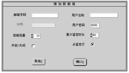 2). 除信箱號碼為必須輸入外,其它各項(xiàng)若不輸入,系統(tǒng)會按缺省值設(shè)置信箱參數(shù)。 3). 設(shè)置完成后按確認(rèn)按鈕即增加一個(gè)信箱號碼。若不想增加,按取消按鈕退出。