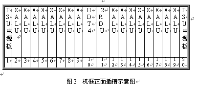 見圖2和3,遠端模塊采用19英寸標(biāo)準(zhǔn)機框,高度為5U,可安裝在各種標(biāo)準(zhǔn)的19英寸的機柜中。機框共20個插槽,正面插板,反面背板出線。每個機框可插20塊各種類型的板件,其中兩邊第1第20槽固定插電源板PSU,中間第10號槽固定插數(shù)字中繼接口板HDT4,其余16個槽為通用槽口,可插16塊各種類型接口板。每塊板為8路,一個機框總共128話路。調(diào)度接口板2RDU固定插第11槽,該板不占機框端口。對于自帶交換系統(tǒng),需要安裝一塊系統(tǒng)信號音板8TDU,該板固定插19槽,占8個端口。