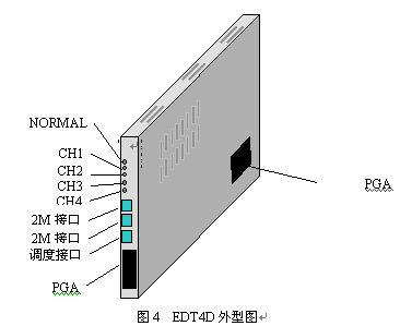EDT4D是在舊EDT4板上增加調(diào)度接口。見圖4,EDT4D為一塊H20-20交換機插板,厚度為兩個槽口。EDT4通過扁平電纜與交換機公共控制機柜的背板PGA相連,提取交換機時隙;并將時隙轉(zhuǎn)換為由四個數(shù)字中繼接口E1組成的準(zhǔn)V5.2接口與遠端模塊相連。一塊EDT4可接2個PGA端口組,共128個話路。