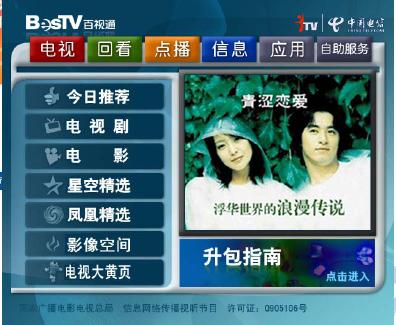 上海IPTV點播節(jié)目達3000小時,包括電影、電視劇、音樂娛樂、紀實節(jié)目、少兒、體育以及教育等欄目。點播節(jié)目改變了“你播我看”的電視被動接受方式,讓用戶可以根據(jù)自己的喜好來選擇喜愛的個性化節(jié)目,大大提高了用戶的喜愛度。值得一提的是,當收看電影中途退出的時候,系統(tǒng)提供了“書簽”功能,下一次收看時,便可以從書簽處繼續(xù),方便用戶使用和體驗。另外,系統(tǒng)提供的“搜索”功能也讓百姓眼前一亮,尋找自己喜愛的影片就更方便了。