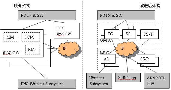 GW軟件改造而來,只需新增CS-P即可?偟膩碚f,核心網(wǎng)的演進(jìn)只是增加CS-P、擴容CS-T、原有的iPAS GW軟件升級為TG/AG,就可以建立其一個具有多種終端接入能力的開放性多媒體VoIP移動軟交換網(wǎng)絡(luò),而原有的PHS系統(tǒng)功能又不會受到影響。