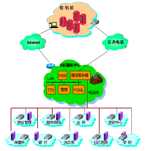 以國(guó)際標(biāo)準(zhǔn)的VXMLl技術(shù)為主導(dǎo)的小區(qū)服務(wù)中心系統(tǒng)可以與互聯(lián)網(wǎng)輕易地連通,從而為小區(qū)的服務(wù)網(wǎng)點(diǎn)走出小區(qū)的地域限制做好技術(shù)上的儲(chǔ)備。vxml的易開發(fā)和易擴(kuò)展性,使得遠(yuǎn)程服務(wù)的增加,幾乎不需要任何成本的追加,任何第三方服務(wù)提供者具備vxml業(yè)務(wù),都可以直接掛到服務(wù)中心上來。