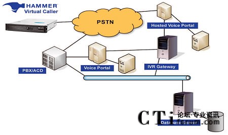 Hammer On-Call IVR測試關(guān)注呼叫中心的自助服務(wù)技術(shù),以運營商網(wǎng)絡(luò)為起點和包括從PSTN接受電話呼叫的PBX/ACD系統(tǒng)、處理電話呼叫的IR(自動應(yīng)答系統(tǒng))或Voice Portal(語音門戶)、載有面向用戶型業(yè)務(wù)的業(yè)務(wù)服務(wù)器(如VXML)、用于語音激活型業(yè)務(wù)的語音識別引擎或者是處理DTMF業(yè)務(wù)的DTMF收集器、文本轉(zhuǎn)換成語音的資源、和用于支持自助服務(wù)環(huán)境下運行業(yè)務(wù)的所有后臺系統(tǒng)。