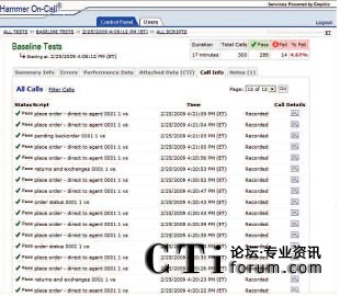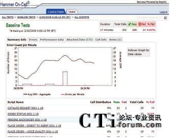 只需使用一個簡單易用的Web接入就可以和Empirix測試小組一起實時跟蹤測試進度。此外,還同時可以查看測試結(jié)果、發(fā)生失敗的類型和導(dǎo)致失敗發(fā)生的測試流量。通話全程記錄功能可以用來記錄相關(guān)通話,從而捕獲和幫助診斷發(fā)生失敗的根源?梢詤⒖枷铝袌D表: