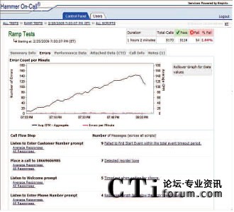 Hammer On-Call IVR測試使用各種各樣的主叫場景模擬真實世界用戶交互。通過改變呼叫量和呼叫場景的混合,Empirix測試專家可以生成指向IVR的模擬真實世界的呼叫流量。此外,在測試中,不同的呼叫測試點上可以使用不同的呼叫率。在測試過程中經(jīng)常會用到三種基本呼叫模型及其變體;緶y試是使用一個恒定的低呼叫率檢驗被測環(huán)境是否已準備好接受呼叫;增量測試是使用一個固定增量穩(wěn)步增加呼叫量一直到達峰值呼叫量,然后,增加呼叫量直至超過期望值,檢驗系統(tǒng)在峰值時段內(nèi)是否有額外容量;最后,‘浸透’測試是在指定的時段內(nèi)使用一個恒定的高呼叫率檢驗系統(tǒng)穩(wěn)定性。