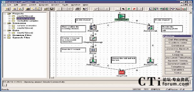 呼叫中心測(cè)試的第一步就是要?jiǎng)?chuàng)建要被測(cè)試的業(yè)務(wù)的呼叫流程圖。可以通過一個(gè)含有標(biāo)準(zhǔn)呼叫流程圖標(biāo)庫的呼叫流程圖形編輯器創(chuàng)建呼叫流程圖。每個(gè)呼叫流程的圖標(biāo)都包含一段Hammer