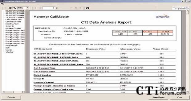 如果響應(yīng)時(shí)間超過設(shè)定的預(yù)置值(閥值),或者發(fā)現(xiàn)任何其它問題時(shí),Hammer可以把這個(gè)錯(cuò)誤和它的位置記錄在數(shù)據(jù)庫中,然后實(shí)時(shí)顯示測(cè)試結(jié)果。Hammer可以模擬呼叫流程中的任何一個(gè)方面,包括DTMF按鍵音可變信息的記錄或者是為測(cè)試支持語音識(shí)別系統(tǒng)而播放大量的語音文件。Hammer專利的語音提示識(shí)別能力更可以自動(dòng)檢驗(yàn)在IVR和ACD/PBX系統(tǒng)中是否正確播放語音提示。