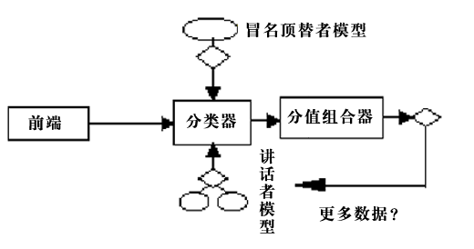 下圖說明了Nuance軟件的處理流程。語音前端處理后,分類器將講話者的語音特性和有關(guān)的講話者和冒名頂替者模型進行比較,產(chǎn)生分值。