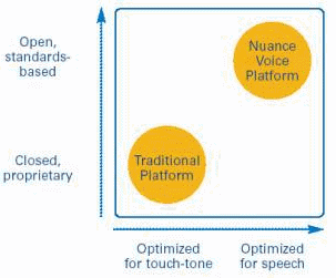 傳統(tǒng)的平臺(tái)是基于封閉的、非統(tǒng)一標(biāo)準(zhǔn)的技術(shù)并為按鍵式輸入應(yīng)用而設(shè)計(jì)的,而Nuance NVP平臺(tái)是開放的、基于統(tǒng)一標(biāo)準(zhǔn)的語(yǔ)音平臺(tái)產(chǎn)品,它能夠支持客戶公司已有的IT投資和基礎(chǔ)設(shè)備,同時(shí)可以加入語(yǔ)音的應(yīng)用,提高了信息傳遞的自動(dòng)化程度和客戶的滿意度。
