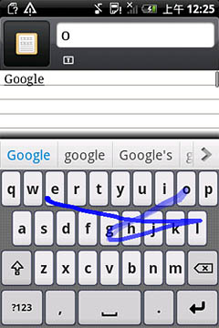 如圖所示,Nuance T9 Trace英文輸入方案對(duì)于各種不同的字母組合都能有效識(shí)別,像“google”這種既有連續(xù)又有間斷重復(fù)字母的單詞也不在話(huà)下,一次就能精準(zhǔn)輸出。另外,該輸入法還可以省去標(biāo)點(diǎn)符號(hào),如“don"t”“can"t”等單詞,用戶(hù)只需滑觸“d-o-n-t”這四個(gè)字母,輸入法就會(huì)自動(dòng)識(shí)別。