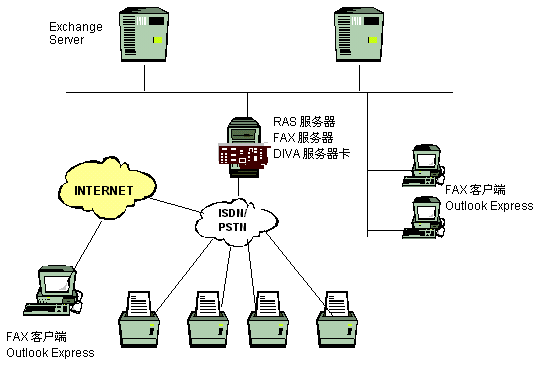 終端設(shè)備:FAX Client(也可以用OUTLOOK 98/EXPRESS)主要是對FAX Mail進行再處理, 比如可以指定到可用的打印機或傳真機打印等。