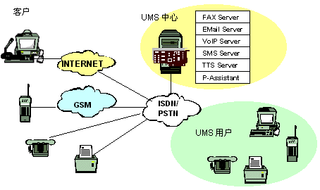客戶用電子郵件、語音、尋呼、移動短消息、傳真等與UMS用戶聯(lián)系,UMS中心啟動相應(yīng)的服務(wù)與客戶建立連接,將客戶所發(fā)信息按識別標(biāo)識直接轉(zhuǎn)發(fā)到UMS用戶或中繼服務(wù)器,若因UMS用戶不在等原因,無法直接聯(lián)系,系統(tǒng)會提示客戶選擇別的方式聯(lián)系。也可將其存儲,并進行必要的格式轉(zhuǎn)換與管理,這時UMS中心可以主動呼叫UMS用戶的手機,傳真機,電話等主動將信息送到,UMS用戶也可以在任何時間、任何地點,從固定電話網(wǎng)(普通電話、傳真機、IC卡電話等)、移動網(wǎng)(GSM、模擬、CDMA、WAP手機、掌上電腦、PDA等)、尋呼網(wǎng)、互聯(lián)網(wǎng)(PC)訪問中心服務(wù)器查詢,索取個人信息。