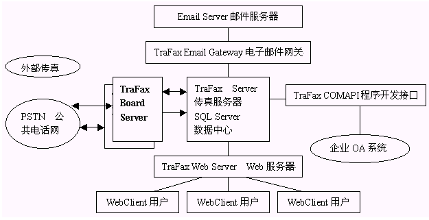 采取TraFax WebClient、TraFax EmailGateWay兩種方式收發(fā)傳真,實現(xiàn)用戶在不同環(huán)境下通過不同方式完成傳真收發(fā)。