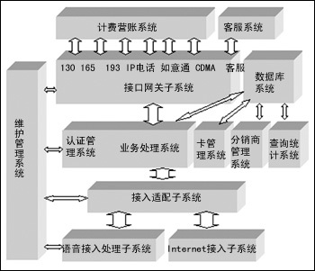 綜合付費平臺的軟件邏輯結(jié)構(gòu)分為語音接入處理子系統(tǒng)、Internet 接入子系統(tǒng)、接入適配網(wǎng)關(guān)子系統(tǒng)、認證管理子系統(tǒng)、業(yè)務(wù)處理系統(tǒng)、卡管理系統(tǒng)、分銷商管理系統(tǒng)、查詢統(tǒng)計系統(tǒng)、數(shù)據(jù)庫系統(tǒng)、接口網(wǎng)關(guān)子系統(tǒng)和維護管理子系統(tǒng)。