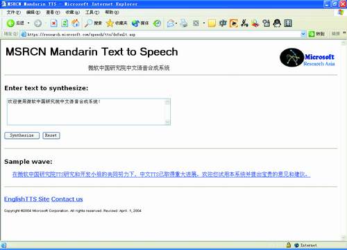 通過(guò)“木蘭”在線(xiàn)演示系統(tǒng):“http://research.microsoft.com/speech/tts”(中文)與“http://research.microsoft.com/speech/engtts”(英文),人們可以親身體驗(yàn)MSRA的研究成果。
