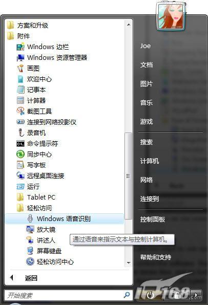 如圖2所示,你也可以在“所有程序|附件|輕松訪問(wèn)”菜單下找到語(yǔ)音識(shí)別特性。圖2 在“輕松訪問(wèn)”菜單中,你也能看到“語(yǔ)音識(shí)別”