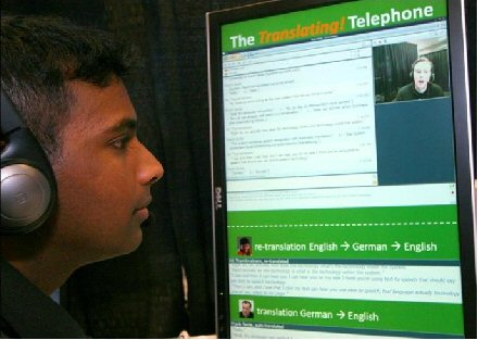 Thambiratnam說(shuō):“當(dāng)多種不同背景的人需要一起交流時(shí),我們的技術(shù)就能提供非常大的便利。”Thambiratnam用同聲傳譯電話展示了這樣一種的情景:Thambiratnam說(shuō)英語(yǔ),他要給他的德國(guó)籍經(jīng)理Frank