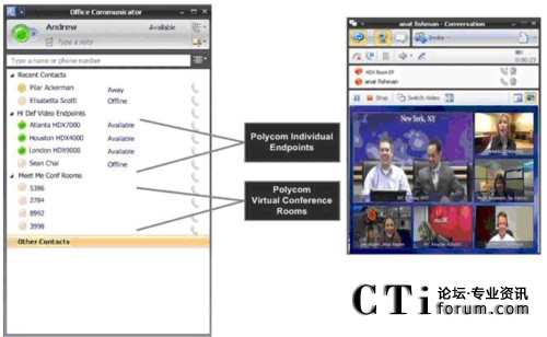 RMX 虛擬會議室出現在 Office Communicator 2007 聯系人列表上,用戶點擊即可加入多點通話。這樣, 商業(yè)用戶就可以在 PC 和高品質視頻終端上輕松開展協作,并保持與各方隨時溝通。