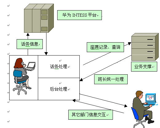 該系統(tǒng)在鐵通CRIS 平臺上運行,前端接入采用華為CC08-A型排隊機,華為INTESS平臺,集成正邦高科座席軟件。完成企業(yè)業(yè)務咨詢、投訴建議的受理、產(chǎn)品訂購、外呼調(diào)查等業(yè)務,并針對各業(yè)務的特色規(guī)劃了企業(yè)的業(yè)務流程。正邦高科客戶服務系統(tǒng)的坐席軟件,和華為INTESS采用緊耦合方式將話務信息和業(yè)務信息結(jié)合在一起,便于統(tǒng)計分析,制訂客戶服務中心的運營策略。在后臺業(yè)務管理系統(tǒng)中,客戶服務系統(tǒng)設計了便于分析業(yè)務的一系列統(tǒng)計報表,使企業(yè)可以方便地對銷售過程進行跟蹤和定單派發(fā)。