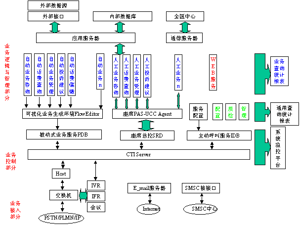 平臺(tái)部分完成系統(tǒng)的基本服務(wù)處理,不針對(duì)具體的服務(wù)業(yè)務(wù),提供電話接入、呼叫控制、人工/自動(dòng)服務(wù)、e_mail服務(wù)、WEB服務(wù)、SMSC服務(wù)等的基礎(chǔ)環(huán)境。業(yè)務(wù)部分完成系統(tǒng)的業(yè)務(wù)描述,按照平臺(tái)的業(yè)務(wù)接口,針對(duì)聯(lián)通1001客戶服務(wù)的每一個(gè)具體業(yè)務(wù)需要,開(kāi)發(fā)相應(yīng)的服務(wù)業(yè)務(wù)功能模塊或流程,實(shí)現(xiàn)系統(tǒng)的服務(wù)業(yè)務(wù)。業(yè)務(wù)部分完全建立在PAS-UCC平臺(tái)之上。