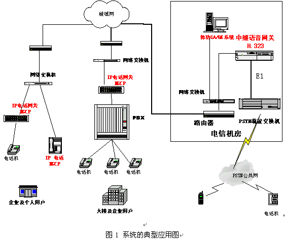 系統(tǒng)的真正價值應(yīng)該在實(shí)際應(yīng)用中得以體現(xiàn)。這套系統(tǒng)的很重要的一個應(yīng)用領(lǐng)域就是VoIP接入網(wǎng)的建設(shè)。其典型的應(yīng)用如圖1所示。
