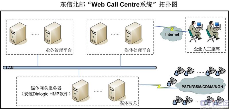隨著中國經(jīng)濟的快速發(fā)展,越來越多的企業(yè)尤其是中小企業(yè)對呼叫中心的需求量越來越大,需求質(zhì)量也越來越高。由于呼叫中心建設(shè)涉及技術(shù)十分專業(yè)、涉及領(lǐng)域也比較廣泛、必須投入巨大的資金購買軟硬件設(shè)備,并且需要大量的維護(hù)力量,因此對于中小企業(yè),尤其是缺乏專業(yè)技術(shù)力量和資金的中小企業(yè)來說,建設(shè)自有的呼叫中心顯得不切實際。正是基于這種情況,EB開始與Dialogic合作,采用其HMP系統(tǒng)軟件,以IP技術(shù)為基礎(chǔ),依托電信網(wǎng)絡(luò),建設(shè)呼叫中心系統(tǒng),以托管方式為客戶提供呼叫中心服務(wù),即Web Call Centre服務(wù)。