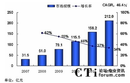再來看看統(tǒng)一市場的前景,下圖是某咨詢公司對國內(nèi)統(tǒng)一通信市場的預(yù)測數(shù)據(jù),2012年將達(dá)到212億元,盡管可能存在一定水份,但這么多公司介入這個市場,本身就體現(xiàn)了發(fā)展?jié)摿Γ@點(diǎn)不容懷疑。