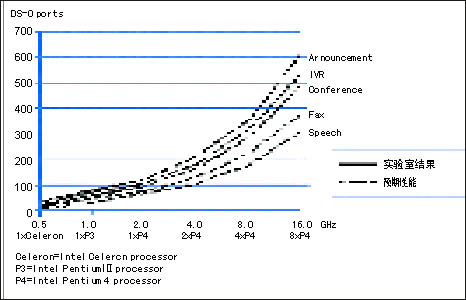 圖1顯示了主要的通信媒體處理功能的實(shí)驗(yàn)測(cè)量結(jié)果和預(yù)期性能。Intel 編制的HMP軟件,在Intel的從566 MHz 到 2 GHz的Celeron和 Pentium 處理器上,已經(jīng)對(duì)語音宣告、IVR和會(huì)議算法完成了實(shí)現(xiàn)、優(yōu)化和測(cè)試。圖1中的實(shí)線表示實(shí)驗(yàn)室中的測(cè)試結(jié)果。Intel的目標(biāo)是實(shí)現(xiàn)這些算法,并擴(kuò)展到更高速的Intel Pentium處理器,雙路、四路、甚至八路Intel Pentium處理器、Intel Xeon處理器以及Intel Itanium處理器。圖1中的虛線顯示了Intel所期望的在未來的實(shí)現(xiàn)中將得到的結(jié)果。目前,HMP的版本主要以Windows為主,很快就會(huì)推出Linux版本。從根本上說,HMP最適合用在純IP的環(huán)境,也可通過擴(kuò)展到多個(gè)服務(wù)器實(shí)現(xiàn)密度的提升。