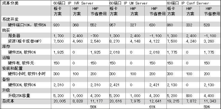 在眾多好處當(dāng)中,對(duì)用戶最有吸引力的無疑是節(jié)省成本。張怡國(guó)特別強(qiáng)調(diào),對(duì)一個(gè)應(yīng)用系統(tǒng)而言,成本的計(jì)算不應(yīng)該單以產(chǎn)品端口購買價(jià)格考核,而應(yīng)該是系統(tǒng)總的建設(shè)成本,包括產(chǎn)品購買成本、服務(wù)器成本、運(yùn)輸、安裝、庫存、升級(jí)等多項(xiàng)費(fèi)用。基于HMP1.1版本,張怡國(guó)作了一個(gè)比較,以60端口IP IVR 60、端口IP UM或者60路會(huì)議為例,和語音板卡處理方式相比,基于HMP軟件實(shí)現(xiàn)能有近60%的成本節(jié)省,其中采購能節(jié)省20%,庫存節(jié)省20%,備份節(jié)省20%,升級(jí)節(jié)省近40%。