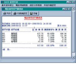 - 每種電話明細(xì)報表皆有提供通話日期、時間、外線號碼、外撥電話號碼、外撥電話類別、通話通數(shù)、通話時間、通話金額、外撥區(qū)域之資料,而且還提供資料匯總。