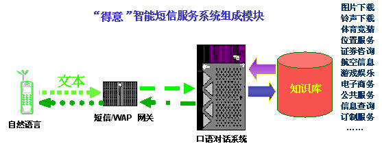 "得意"智能短信系統(tǒng)是在現(xiàn)有的數(shù)據(jù)通信和短信服務(wù)的技術(shù)平臺上,加入基于中文語言理解技術(shù)的"得意"口語對話系統(tǒng),從而能夠讓用戶在手機(jī)上以自然語言的形式享受指定領(lǐng)域的智能短信服務(wù)。智能短信系統(tǒng)對短信文本進(jìn)行自動分析和理解,再從知識庫中提取用戶所需的信息,然后自動產(chǎn)生智能應(yīng)答語句,并以短信文本的形式發(fā)回用戶。由于"得意"口語對話系統(tǒng)具有上下文相關(guān)理解和人機(jī)混合主導(dǎo)等強(qiáng)大功能,在規(guī)定的領(lǐng)域內(nèi),用戶可通過一個或者多個短信構(gòu)成一組對話,完成復(fù)雜的信息查詢或者其他互動服務(wù)。