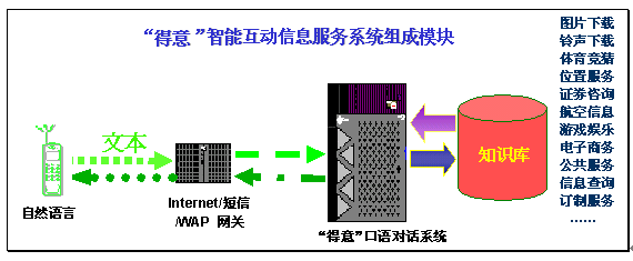在現(xiàn)有的數(shù)據(jù)通信和信息服務(wù)的技術(shù)平臺(tái)上,加入"得意口語對話系統(tǒng)運(yùn)行平臺(tái)",就能夠讓用戶在通過Internet/SMS/WAP等各種通信手段,在電腦、手機(jī)等設(shè)備上以自然語言的形式享受相關(guān)領(lǐng)域的智能互動(dòng)信息服務(wù)。