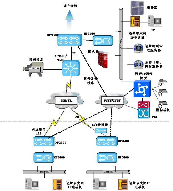 整個(gè)網(wǎng)絡(luò)采用了一臺(tái)MP3600企業(yè)級(jí)路由器和兩臺(tái)MP2600帶有語音模塊的路由器組建。核心路由設(shè)備由邁普MP3600模塊化路由器擔(dān)當(dāng),它直接連結(jié)上級(jí)網(wǎng)絡(luò),與MP9400/9600DDN節(jié)點(diǎn)機(jī)構(gòu)建的專網(wǎng)相連。在計(jì)費(fèi)和呼叫管理中心采用了10M/100M的MP5100簡單網(wǎng)管型交換機(jī)作為網(wǎng)絡(luò)接入設(shè)備與核心路由設(shè)備連接,同時(shí)采用了防火墻隔離設(shè)備,以增強(qiáng)網(wǎng)絡(luò)安全系數(shù)。