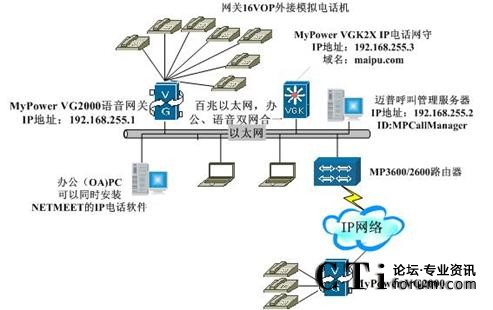 在這種應(yīng)用中,用戶通過(guò)IP網(wǎng)絡(luò)接入以太網(wǎng)IP電話機(jī)的同時(shí),還可以在MyPower VG2000 IP語(yǔ)音網(wǎng)關(guān)上插入兩張16VOP IP電話模塊,接32個(gè)普通電話機(jī)。這32個(gè)電話機(jī)就像其它以太網(wǎng)IP電話機(jī)一樣可以和其它IP網(wǎng)上的IP電話機(jī)互相呼叫,此時(shí),我們把MyPower VG2000 IP語(yǔ)音網(wǎng)關(guān)作為一個(gè)小型的PBX接入平臺(tái)。