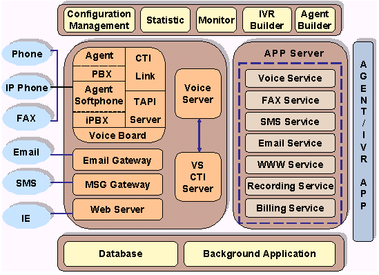 Server負責(zé)將這些信息收集在一起,供應(yīng)用服務(wù)器使用;同時VoiceServer和CTI Server同時將各種數(shù)據(jù)和信息進行解釋,將任務(wù)提交給各種硬件和接入設(shè)備執(zhí)行。