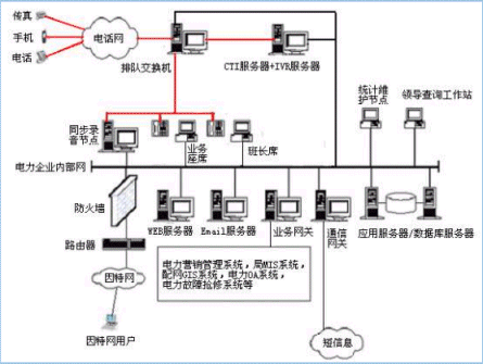 。。用戶利用電話、傳真、電子郵件、因特網(wǎng)、手機(jī)、網(wǎng)絡(luò)電話等撥打某一特服號(hào)碼(如95598)進(jìn)入電力多媒體客戶服務(wù)中心系統(tǒng),本系統(tǒng)依托電力企業(yè)各類業(yè)務(wù)技術(shù)支持系統(tǒng),通過人工受理或自動(dòng)語音服務(wù)等方式為各類客戶提供全天24小時(shí)不間斷的電力服務(wù);形成了對(duì)外服務(wù)于用戶的無形窗口,對(duì)內(nèi)管理、分析、決策系統(tǒng)相結(jié)合的新型客戶服務(wù)中心。