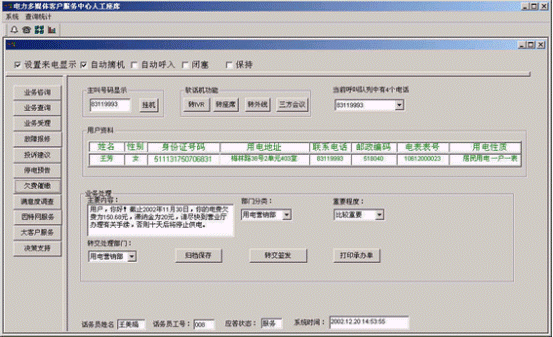 。。提供電話、傳真、電子郵件、因特網(wǎng)、手機(jī)、網(wǎng)絡(luò)電話等多種通訊方式接入和呼出,全天候24小時(shí)服務(wù);無論以何種方式接入系統(tǒng),都可以用統(tǒng)一的方式進(jìn)行后臺(tái)處理,全面體貼居民的需要,有效擴(kuò)大電力系統(tǒng)的服務(wù)范圍!