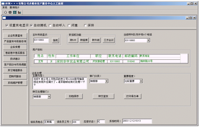 座席前端應(yīng)用軟件使用全中文的圖形化用戶界面,給座席代表提供最大的易用性,其所實現(xiàn)的功能可以完全根據(jù)企業(yè)()提出的要求來定制。