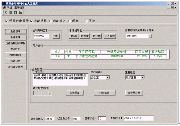 煙草公司呼叫中心將接入功能、導(dǎo)航功能、自動(dòng)語音查詢功能、人工座席服務(wù)功能、話路轉(zhuǎn)接功能、信息資料處理緊密聯(lián)系起來。用戶撥打特服電話號碼后,可以根據(jù)需要選擇人工服務(wù)、自動(dòng)語音查詢、自動(dòng)留言,并能夠在幾種服務(wù)中來回切換或轉(zhuǎn)接其它電話;所記錄的資料可以分門別類的進(jìn)行統(tǒng)計(jì)并形成報(bào)表,供相關(guān)部門進(jìn)行檢索查閱;意見處理完畢,可由座席主動(dòng)呼叫用戶,告知處理意見,形成閉環(huán)處理流程。