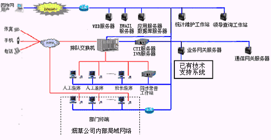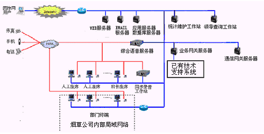 卷煙經(jīng)銷戶等客戶利用電話、傳真、電子郵件、因特網(wǎng)、手機(jī)、短消息等撥打統(tǒng)一的特服號碼(如800XXX或9XXXX)進(jìn)入煙草公司呼叫中心,本系統(tǒng)依托煙草公司各類業(yè)務(wù)技術(shù)支持系統(tǒng)和網(wǎng)絡(luò)系統(tǒng),實(shí)現(xiàn)煙草專賣局原有管理系統(tǒng)/業(yè)務(wù)系統(tǒng)及數(shù)據(jù)庫的無縫連接,通過人工受理或自動(dòng)語音服務(wù)等方式全天24小時(shí)不間斷地為客戶提供各種服務(wù)。