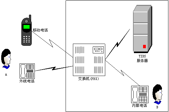 如圖1所示,在一個(gè)典型的應(yīng)用環(huán)境里,TIDS系統(tǒng)可與公司或單位的電話交換機(jī)通過(guò)一條或若干條模擬電話線相連。未來(lái)TIDS的版本將可支持E1/T1數(shù)字中繼線?梢詫IDS設(shè)置為缺省的電腦話務(wù)員,即用戶呼叫直接由TIDS系統(tǒng)處理;也可以分配一個(gè)分機(jī)號(hào)碼給TIDS,當(dāng)用戶需要時(shí)可撥該號(hào)碼使用TIDS服務(wù)。在后一種情況下,最好是在交換系統(tǒng)的問(wèn)候語(yǔ)中提示用戶如何撥打TIDS系統(tǒng)。