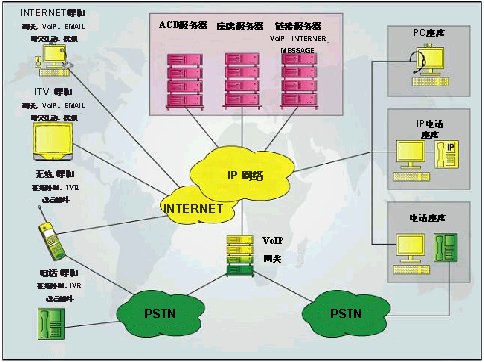 | 集中管理、分布式座席 | 基于IP網(wǎng)絡(luò)、先進的ACD、用戶端軟件 |