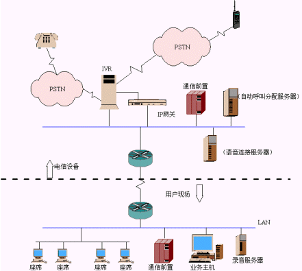根據(jù)目前連鎖零售服務(wù)企業(yè)的業(yè)務(wù)模式,現(xiàn)提供一個由IVR自動語音應答系統(tǒng)和以IP網(wǎng)絡(luò)為基礎(chǔ),以純軟方式交換的呼叫中心相結(jié)合的整體解決方案。即由吉亞公司在北京通信公司建立一個總的系統(tǒng)信息平臺,平臺包括IP網(wǎng)關(guān)、ACD服務(wù)器、IVR自動語音回復系統(tǒng)。信息平臺與連鎖零售服務(wù)企業(yè)的局域網(wǎng)通過ATM、DDN或幀中繼等專線連接,實現(xiàn)與客服人員和后臺數(shù)據(jù)庫的無縫連接,在連鎖零售服務(wù)企業(yè)內(nèi)部僅需提供多媒體電腦和客戶服務(wù)人員即可。