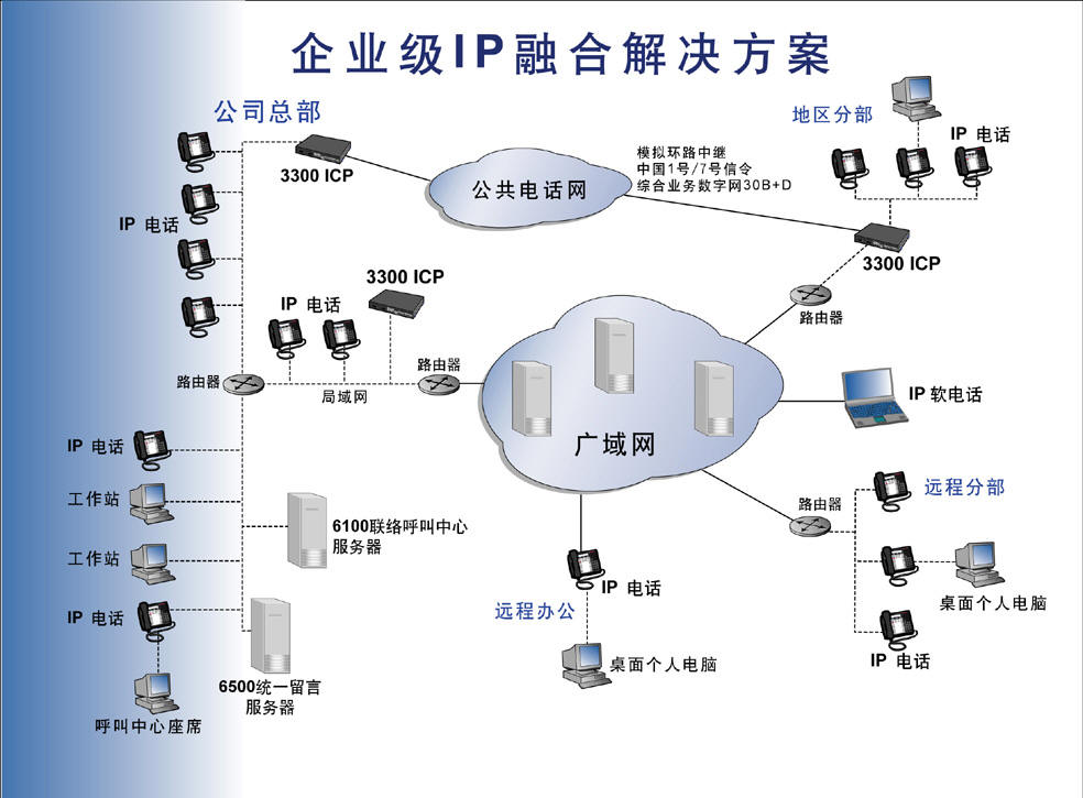 3300ICP既支持IP又支持電路交換轉(zhuǎn)換模式,因此它可以作為企業(yè)寬帶網(wǎng)或作為現(xiàn)有語(yǔ)音結(jié)構(gòu)網(wǎng)絡(luò)中的一個(gè)附件,為辦公分支機(jī)構(gòu)或部門(mén)提供語(yǔ)音信息包服務(wù)。