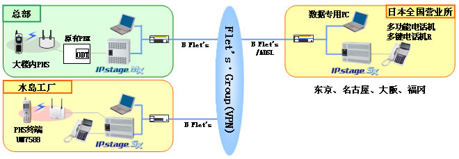 SX”通過SIP協(xié)作的IP電話系統(tǒng)。系統(tǒng)中所采用的“IPstage MX/SX”通過NTT西日本的VPN服務(wù)“Flet's・Group”相互連接,實現(xiàn)高音質(zhì)的內(nèi)線環(huán)境。使用內(nèi)線電話號碼進行事業(yè)所之間的通話聯(lián)系,可以直接與想聯(lián)系的對象通話,無需傳叫電話。進而,由于工廠采用了沖電氣所制造的PHS終端“UM7588”,可以在工廠任何地方實現(xiàn)直接電話聯(lián)系。導入該系統(tǒng)后,即使業(yè)務(wù)場所分處幾地,也能成功實現(xiàn)員工間的迅速溝通。