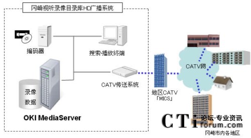 該系統(tǒng)以IP視頻傳輸系統(tǒng)“OKI MediaServer”為基礎(chǔ),是采用支持HD編碼裝置的錄像目錄庫系統(tǒng)。通過簡單的GUI操作可以把編制成目錄的圖像制作成電視廣播節(jié)目并通過CATV電視臺播放。