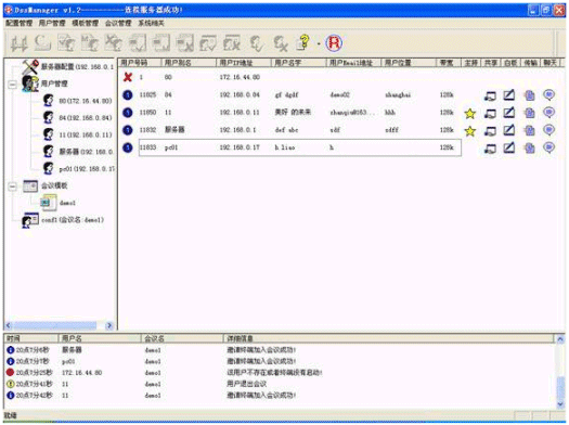 簡(jiǎn)單方便的用戶管理,可以增加用戶、修改用戶信息、刪除用戶等。在會(huì)議中可以實(shí)時(shí)地檢測(cè)和顯示用戶的網(wǎng)絡(luò)狀態(tài)。